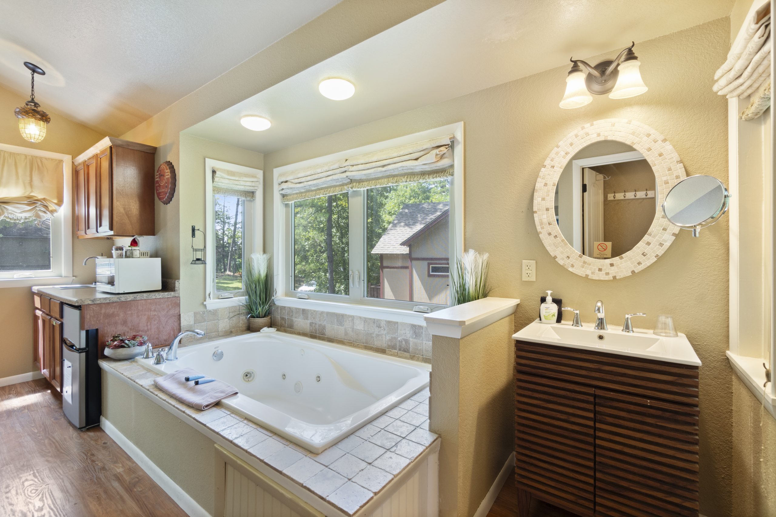 The Grand Treehouse Resort is in the heart of Eureka on W Van Buren.  The resort is on a beautiful heavily wooded (lots of big pines) 5 acre lot.  You’re in town but in the woods.